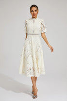 هذا الفستان يتميز بلمسات أنيقة وقصة متوسطة تجذب الأنظار. مثالي لحفلات الزفاف، الحفلات في الحدائق أو الأمسيات الحميمة. إنه يجسد جوهر الأناقة الخفية.