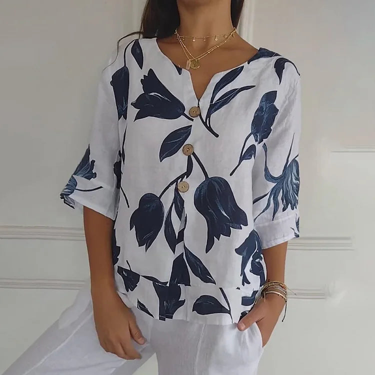 Tento blůza okouzluje svým jemným květinovým potiskem a elegantním výstřihem do V. Její volný střih a krátké rukávy poskytují pocit lehkosti a pohodlí. Knoflíky na přední straně dodávají klasický nádech a usnadňují oblékání.