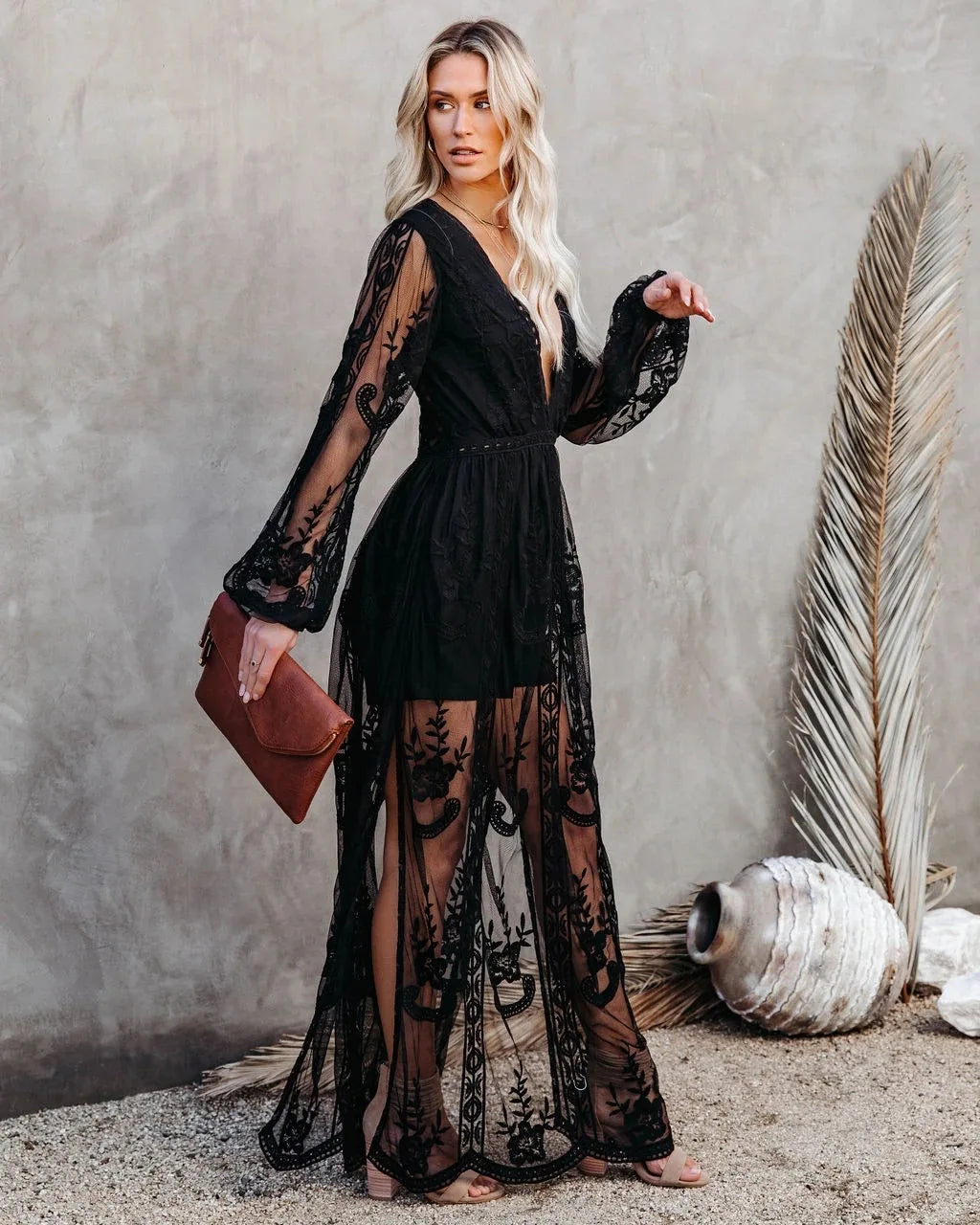 Věra | Dlouhá Černá Šaty Vyšívaná Silueta Elegantní A Moderní