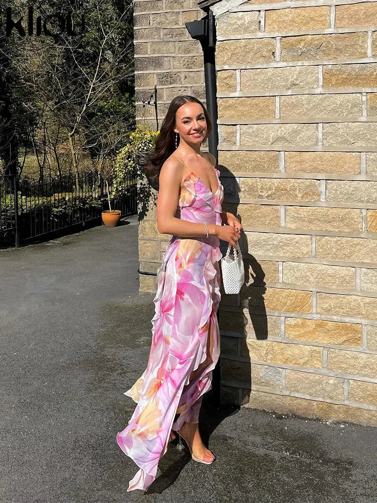 Adeline | Dlouhá květinová tištěná šaty z tylu s rozparkem – elegance a rafinovanost