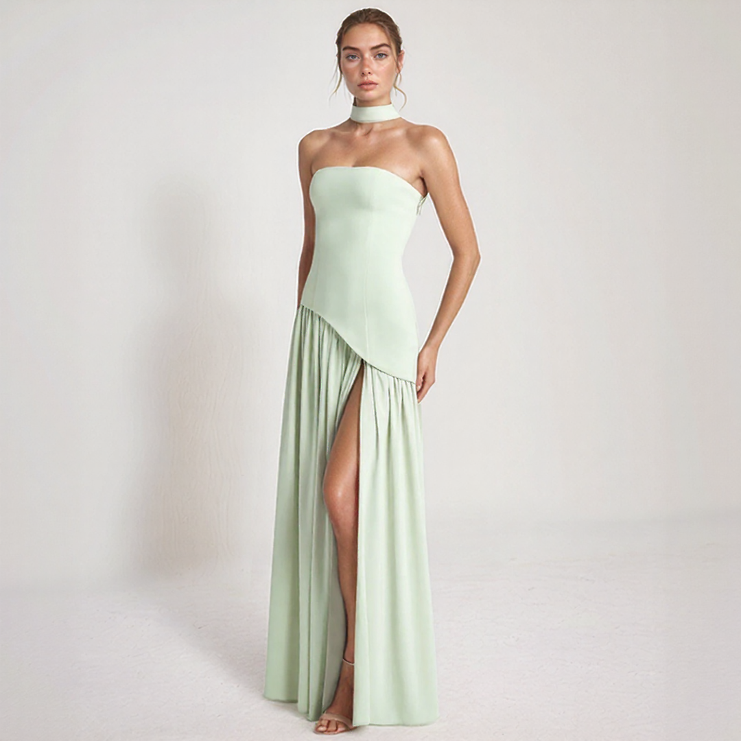 Denne lange kjole fremhæver silhuetten takket være sit strukturerede og stropløse korset. Den sidelægning tilføjer et strejf af femininitet og selvsikkerhed. Ideel til elegante aftener, den kombinerer charme og komfort.