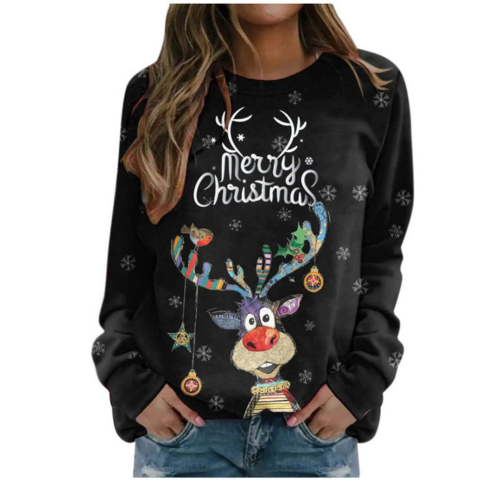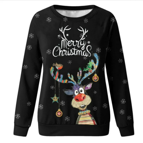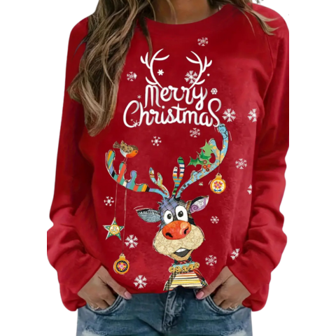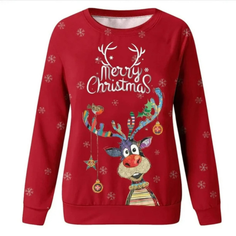 Dieser Pullover zeigt einen fröhlichen und bunten Rentier-Print. Die Schneeflocken und Dekorationen verleihen eine visuelle Note, die den warmen Geist der Saison widerspiegelt. Er ist leicht im Alltag zu tragen und fügt jedem Outfit für das Jahresende eine verspielte Note hinzu.