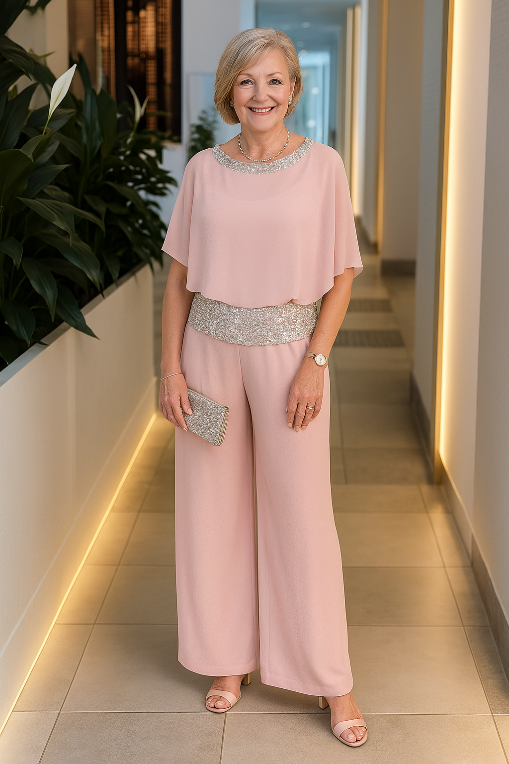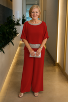 סט האלגנטי הזה לנשים משלב אלגנטיות ורבגוניות ביום-יום. הוא מורכב מכנסיים קלילים עם נפילה אלגנטית וחולצה עם פרטים מוקפדים. אידיאלי לאירועים פורמליים כמו גם ליציאות יותר לא פורמליות.
