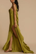 この流れるようなロングドレスは、自然な美しさとエレガンスでシルエットを引き立てます。シンプルなカットに控えめなスリットが加わり、シックさと女性らしさの完璧なバランスを生み出します。特別な occasion やフォーマルな夜に最適です。