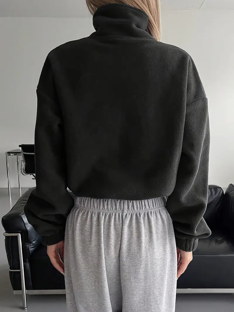 Această jachetă scurtă cu fermoar oferă un echilibru perfect între stil și confort. Croiala sa modernă și gulerul înalt pun în valoare un aspect relaxat și elegant. Ideală pentru zi cu zi, se potrivește ușor cu ținute simple pentru un look chic fără efort.